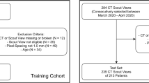 For each selected patient, we extracted and anonymized thoracic CT scans from the hospital’s picture archiving and communication system (PACS). We incorporated CT scans from the time of transplantation to either the time of data extraction, the date of the patients’ demise or their second transplantation. Within the inclusion period, patients presented for a CT scan between one and eighteen times and the majority of patients had between three and ten visits (80%). We did not limit the included CT scans by the reconstruction algorithm or dose parameters. Whenever PACS contained more than one CT reconstruction of a scan, we retained all reconstructions, including, for example, one reconstruction with the lung/sharp kernel and one reconstruction with the soft/standard kernel for the same acquisition. As shown in Table 1, majority of the included scans were reconstructed once in high resolution (slice thickness ≤ 1.25 mm, lung kernel) and once with thin slices but standard kernel, or with thick slices (slice thickness > 1.25 mm) and the standard kernel. Scans with pixel size larger than 0.75 mm in the transverse plane and ones containing less than fifty transverse slices were excluded. Finally, the entire set of scans was inspected by a pulmonologist (NM), who removed 7 scans of 3 patients with lung infiltrates in more than one lobe. Since extensive lung infiltrates are easily identified in the scans, they do not constitute an important confounding disease. At the same time, they could confuse the DNN due to their distinct appearance and the small number of such scans in the training set. For patients not diagnosed with BOS, this approach resulted in 228 scans. Patients eventually diagnosed with BOS contributed a total of 163 scans, with 105 scans acquired after the onset of the disease. The onset was defined as the time when the FEV1 consistently fell below 80% of the patient’s best value, computed as the average of the two best measurements taken at least three weeks apart, in alignment with clinical guidelines21. The scan selection protocol is shown in Fig. 1. The summary of the included scans can be found in Table 1.