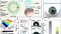 Zigzag ablation patterns with large incision areas covering the entire pupil where visual axis exists is designed, so that any damage in the pathway would impact on visual acuity, visual function, and retinal electrophysiologic responses to visual stimulation. Corneas are stained with fluorescein and recorded four times: preoperatively (baseline), immediately (0 h), 3 days (3 d) and 7 days (7d) after surgery. The laser scanning speeds are a 4 mm s−1 (Group 1), b 6 mm s−1 (Group 2), and c 8 mm s−1 (Group 3). In 3 days postoperatively, Group 2 shows the smallest colored area, with fluorescence only measured at the intersection of scanning trace, while Group 1 and 3 exhibit larger areas of fluorescence (marked by yellow dotted circles). After 7 days, the stained region mostly vanishes, indicating that the epithelial defects are largely healed, although a small area of fluorescence can still be observed in Group 1. Incisions in the three study groups reveal distinct degrees of haze and reduction of the cornea transparency (marked by white dotted circles). As in (a–c), group 2 has much smaller haze area than those in group 2 and 3. d Histological images of eyeballs which are sectioned and stained with hematoxylin and eosin 1 month after the surgery with different scanning speed. e present the corresponding histological images of control groups. All study groups are structurally intact and homogeneously distributed. Compared to control groups, while residual craters can still be observed in Group 1, notably in Group 2, smooth cornea without noticeable ablation trace is exhibited, thanks to the best ablation speed and thus least collator damage.