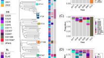 Single-nucleotide polymorphisms (SNPs) between specific genome sequences against the reference genome sequence (GenBank accession no. PDLW01000000) were analyzed using MUMmer v3.118, revealing a total of 105,059,827 SNPs. Phylogenetic trees were constructed using Gubbins (v2.4.0)19 and RAxML-NG (GTRGAMMA model)20. Bayesian analysis of population structure (BAPS) groups was determined using Fastbaps21. Multilocus sequence typing (MLST) was conducted using fastMLST (v0.0.15)22, and a minimum spanning tree was generated using PHYLOViZ 2.023. ARGs and plasmid replicons were identified using ResFinder (v.4.5.0)24 and PlasmidFinder (v.2.1)25, respectively. ARG variants were matched with their alleles based on the CDC & FDA Antimicrobial Resistance Isolate Bank (https://wwwn.cdc.gov/ARIsolateBank/GeneGlossary). Correlations between ARGs and plasmid replicons were assessed using the Pearson correlation coefficient test26. VFGs were identified using Abricate (v1.0.1) by comparing genome assemblies against the Virulence Factor Database. Additionally, we used Kleborate to complement species identification and systematically assess the presence of resistance and virulence determinants, as well as STs and virulence scores (https://github.com/katholt/Kleborate)27.