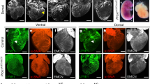 Whole hearts were cleared using an iDISCO (immunolabeling-enabled three-dimensional imaging of solvent-cleared organs) protocol adapted from previous work62. Hearts were dehydrated by methanol/water series (20%, 40%, 60%, 80%, 100%, each 1 hour) and pretreated with 66% dichloromethane, 33% methanol at room temperature overnight. Samples were washed in methanol twice before bleaching in chilled fresh 5% H2O2 in methanol, shaking overnight. Hearts were then rehydrated by methanol/water series (80%, 60%, 40%, 20%, PBS, 1 hour each). Pretreated samples were washed in 0.2% Triton X-100 PBS before incubation in permeabilization solution (0.2% Triton X-100, 0.3 M glycine, 20% DMSO, PBS) for 2 days, shaking at 37 °C. Hearts were then moved to blocking solution (0.2% Triton X-100, 6% donkey serum, 10% DMSO, PBS) for 2 days, shaking at 37 °C. Hearts were then incubated in primary antibody solution (1:300 in 0.2% Tween 20, 10 mg ml−1 heparin, 3% donkey serum, 5% DMSO, PBS) for 7 days, shaking at 37 °C. Samples were then washed 5 × 1 hour in 0.2% Tween 20, 10 mg ml−1 heparin PBS, shaking at room temperature. Hearts were subsequently incubated in secondary antibody (1:300 in 0.2% Tween 20, 10 mg ml−1 heparin, 3% donkey serum, PBS) for 7 days, shaking at 37 °C, before being washed 5 × 1 hour in 0.2% Tween 20, 10 mg ml−1 heparin PBS. Hearts were then dehydrated in methanol/water series and incubated in 66% dichloromethane, 33% methanol for 3 hours. Samples were then moved to 100% dichloromethane for 2 × 15 minutes before incubation in dibenzyl ether for 2 days to clear the tissue. Samples were refractive index matched by moving to ethyl cinnamate overnight. Whole-mount samples were imaged in ethyl cinnamate using an LaVision UltraMicroscope II light-sheet microscope.