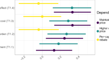 We cluster standard errors on survey level to account for non-independence of observations. We then estimate our model with the maximum likelihood method. The \(\beta\)-coefficients and their p-values provide the direction and the significance of the effects of the moderator variables: A positive \(\beta\) suggests that a moderator variable increases the probability of obtaining an increase in public support when introducing a revenue recycling mechanism \(\Pr (y=1)\). We provide marginal effects at mean, which show the magnitude of the probability change for the two possible outcomes induced by the moderator variables. We report the Pseudo R2 as a measure of fit39. We also test the validity of the logit specification by OLS regressions (see Supplementary Table 8).
