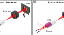 In this work (see rendering in Fig. 1, we rely on a DMD to generate structured illumination patterns due its low cost, large spectral acceptance range, fast speed, and reproducible quality. As discussed above, DMD’s are beam shaping devices which are commonly used in commercial video projectors and have recently been applied to a wide variety of biomedical applications, including SIM31,32,33,38,39. However, DMD’s are primarily designed for use with incoherent light, and working with coherent light introduces several challenges. Most significantly, the complex DMD diffraction hampers their use in multicolor laser systems as compared with LCoS SLM’s. Additionally, DMD’s can introduce aberrations into the illumination system both due to the mirror arrays not being optically flat and also the presence of a thick glass window which is a few millimeters away from the vacuum-sealed micromirrors.