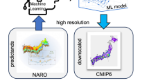 θ is the angle of the incident beam. All parameters are measured in W m−2. To feed our network with suitable meteorological data, we use a unique sampling method to find relevant pairs of DHI, DNI, sun azimuth and sun elevation. Using the historic weather data from recent years, a thorough analysis was conducted to find the best sampling points of the different weather parameters for each hour. In order to sample through the different parameter values, a k-means clustering 22,23 was used. The solar position comprising of the azimuth and the elevation parameters for every hour is obtained using the python package pvlib24. The weather data of each year are separated into months. Using the k-means clustering algorithm, the data is clustered into different groups based on the DHI, DNI and solar positions. The data is split into 40 clusters, resulting in at least one sampling point at every hour between 05:00 and 20:00. Figure 3 shows the 3D visualization of the clusters, obtained by the clustering algorithm for the month of August. The x-axis shows every hour during daytime, i.e. 4 a.m. to 8 p.m. The y-axis shows the range of DNI in W m−2, whereas the z-axis shows the range of DHI in W m−2. Each plotted datapoint is color-coded according to the cluster it belongs to. The large hexagon-shaped black dots indicate the cluster centers. As shown, the cluster centers are well distributed over the weather data which indicates a representative sampling, allowing an efficient creation of training data.