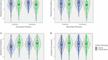 Support for Affirmative Action. Participants’ support for affirmative action was measured using a scale developed by Kteily et al.28, which assesses both support for “indirect” affirmative action (e.g., “Giving training to certain groups so they can compete equally”; r = 0.76), and “direct” affirmative action (e.g. “Using memberships in certain groups as a tie-breaker when applicants are equally qualified”; α = 0.89).