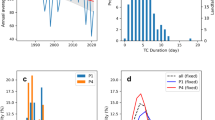 where \({C}_{{Lat}}\) and \({C}_{{Lon}}\) are the latitude and longitude coordinates of the location of the annual TC impact centroid, respectively. \(N\) is the total number of grids in the TC impacts. \({{TCI}}_{i}\) is the annual TC impacts of the ith grid. \({{Lat}}_{i}\) and \({{Lon}}_{i}\) are the latitude and longitude coordinates of the annual TC impacts of the ith grid, respectively.