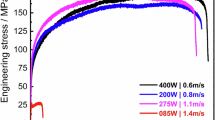 Micro-tensile test coupons were extracted from the sample block using electric discharge machining (EDM) by cutting the contour of the specimen profile before slicing the specimen off of the substrate material. The gauge section of the specimen was 2 mm in width and 8 mm in length. The detailed drawing of the miniature tensile bar used is shown in Figure S1. Each specimen was consequently ground on both sides to 400 grit level to remove the oxide layer formed during EDM. To reveal the internal microstructures, one side of each sample was further ground with 600, 800, 1200 and 2000 grit grinding paper, followed by polishing with 1 µm, 0.3 µm, 0.1 µm alumina solution and finally 0.08 µm colloidal silica solution. The unpolished sides of each sample were spray painted white and finely dotted with ink for strain measurement during micro-tensile tests. In addition, the remaining printed material after extraction of tensile specimens were polished using the aforementioned sequence of steps to 0.08 µm colloidal silica solution for grain size characterizations detailed in “Microstructural Characterization”.