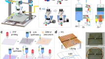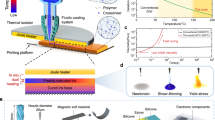 where \(G\) represents the shear modulus of the material, \(d\) is the spring wire diameter, \(D\) is the mean diameter of the spring, and \({n}_{a}\) is the number of active coils. The calculated values were consistent with the experimental results, yielding a predicted value of 241.8 Nm−1 for DCPD [150 ppm] and 245.9 Nm−1 for DCPD-co-iPrSi8. These findings emphasize that the consistency of the spring constants, regardless of the ink’s front velocity, reflects the system’s ability to print highly reproducible geometries from different resins. The developed in situ monitoring system successfully adjusts printing parameters based on the ink’s front velocity, enabling the precise fabrication of complex 3D-printed parts with varying resin formulations. This capability demonstrates its broad applicability for any thermoset resin system requiring adaptable front-velocity control.