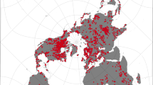 Climatic variables consist of (i) 12 monthly minimum and maximum temperature and precipitation variables, and (ii) 19 long-term hydroclimatic variables following the bioclim framework22. For each, we computed the average and weighted average for temperature variables (units in °C * 10), and the sum and inverse distance weighted sum for precipitation variables (mm). Likewise, the hydroclimatic variables consist of the monthly average and sum, and the monthly inverse distance weighted average and sum for the aggregations (e.g., upstream sum of precipitation during the warmest quarter). The climate data derives from the WorldClim data base6, consisting of monthly gridded climate data interpolated between point locations across the globe, and averaged across the years 1950–2000 on a 30-arc-second spatial grain.