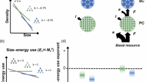 where B is either metabolic rate, or extra-metabolic energy use12,19. In equation 1, the exponents of 1/4 for lifespan and −1/4 for birthrate cancel and so R0 must equal one for any non-growing population regardless of mass. However, equation 2 provides a means of evaluating the effects of per capita energy use on R0 via the energy-based allometries for b and E, by writing it generally as a function of energy with unknown coefficients: