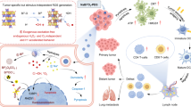 The aqueous solution of PEGylated WO2.9 NRs (100 μg/mL) showed a blue color with strong absorption in the NIR region (Fig. 2a), which was attributed to the strong localized surface plasmon resonances (LSPR) of the NRs59. The strong NIR absorption of PEGylated WO2.9 NRs motivated us to investigate their potential application as photothermal agents. The temperature increase of the aqueous solution in the presence of the PEGylated NRs as a function of the NR concentration (60 to 1200 μg/mL) under the 980 nm laser irradiation shows that the solution temperature increase can reach 41.7°C at the NR concentration of 1200 μg/mL and higher concentration of NRs leads to more prominent temperature increase (Figs. 2b and S2a). In contrast, the water solution in the absence of NRs does not show any obvious temperature increase under similar experimental conditions (Fig. 2b). To assess the NIR photostability of PEGylated WO2.9 NRs, five cycles of Laser on/off were performed by irradiating the aqueous solution of PEGylated WO2.9 NRs via a 980 nm laser for 10 min (Laser on), followed by cooling down to room temperature without NIR laser irradiation for 30 min (Laser off). As shown in Fig. 2c, the temperature increases of 20.1°C and 30.3°C were able to be achieved after the first laser on for the NR concentration of 100 and 750 μg/mL, respectively. No significant change in the temperature increase was observed after five cycles. Furthermore, the absorbance of the NRs (180 μg/mL) at 980 nm remained stable even after ten cycles of laser irradiation (Fig. S2b).