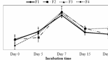 The starter culture and the inoculum were prepared according to our previous study9. P. polymyxa cells from PDA medium were used to inoculate 500 mL Erlenmeyer flasks containing 100 mL of sterilized (121°C, 20 min) SPSW. After 24–32 h incubation at 30°C in a rotary shaker (250 rpm), inoculum from this broth was used as a seed culture. For the optimization of biofertilizer production, relevant factors such as temperature, pH and rotational speed were investigated using the one-factor-at-a-time method. A time course experiment up to 24 h was carried out in Erlenmeyer flasks (500 mL) containing 148 mL of sterilized SPSW with 2 mL P. polymyxa inoculum. To determine the optimal starting pH for biofertilizer production, the pH (5–8) of the medium was adjusted by the addition of 1 M HCl and 1 M NaOH before sterilization. To determine the optimal temperature for biofertilizer production, liquid cultures were incubated at 20°C, 24°C, 28°C, 32°C, 36°C and 40°C. For optimization of rotational speed, cultures were shaken at 50, 100, 150, 200, 250 and 300 rpm. All experiments were conducted in duplicate and key results were repeated three times to establish their validity.