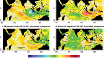 The AC region is modulated by interannual and decadal climate modes in the Indian and Pacific Ocean, partly through their influence on the circulation in the South Indian Ocean17,18,19,20 and also through local ocean-atmosphere interactions driven by these modes17,21,22,23. This strong interannual and decadal variability may be superimposed on the long-term trend in AC SST that could partly be related to changes in the subtropical Indian Ocean gyre strength on these time scales24,25,26. The Indian Ocean gyres weaken during El Niño or positive Indian Ocean Dipole (hereafter IOD) events whereas they strengthen during La Niña or negative IOD events. The same holds true for subtropical Indian Ocean dipole (hereafter SIOD) phases18,20. On decadal time scales, ENSO-like (El Niño-Southern Oscillation) decadal variability and/or the Pacific Decadal Oscillation (PDO) is thought to exert an influence on southwestern Indian Ocean SST and atmospheric circulation22,27.