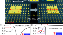 The majority of numerical calculations were performed using an in-house FDTD method34,35. The transmission and reflection for the periodic metasurface were calculated using a single unit cell with periodic boundary conditions parallel to the metasurface and perfectly matched layers normal to the metasurface. For the simulation of the disordered and amorphous arrangements we similarly employed a super-cell approach. Each periodic super-cell contained 225 particles and had a total size of 7.65 × 7.65 μm2. For each wavelength we used monochromatic plane wave excitation to properly take into account the dispersion of the metal.
