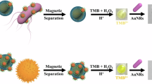 Colorimetric assays were performed on a 96-well plate as illustrated in Fig. 1b. In short, 100 μL of bacteria/MBs complex was mixed with equal volume of substrate solution (containing 100 mM citric acid, 200 mM Na2HPO4, 0.32 mM TMB and 2 mM H2O2, pH 4.3). The plate was incubated for 30 min at room temperature for color developing. After color development, the reaction was stopped with 2 M sulfuric acid (50 μL/well) and then the solution in the wells was transferred to a new plate with the aid of a magnetic separator. Optical density (OD) was measured at 450 nm using a microplate reader (iMark, Bio-rad).