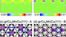 The crystallographic model of graphene/Ir(111) and graphene/Cu/Ir(111) presented in Fig. 1 was used in the DFT calculations, which were carried out using the projector augmented plane wave method38, a plane wave basis set with a maximum kinetic energy of 400 eV and the PBE exchange-correlation potential39, as implemented in the VASP program40. The long-range van der Waals interactions were accounted for by means of DFT-D2 approach proposed by Grimme41. The studied system is modelled using supercell, which has a (9 × 9) lateral periodicity and contains one layer of (10 × 10) graphene on a five-layer slab of metal atoms. Metallic slab replicas are separated by ca. 20 Å in the surface normal direction. To avoid interactions between periodic images of the slab, a dipole correction is applied42. The surface Brillouin zone is sampled with a 7 × 7 × 1 k-point mesh centered the Γ point.