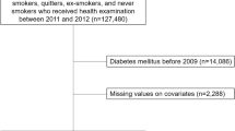 Hepatic steatosis was diagnosed according to the guidelines established for the diagnosis and treatment of NAFLD issued by the Fatty Liver Disease Study Group of the Chinese Liver Disease Association29. Specifically, hepatic steatosis was diagnosed according to characteristic echo patterns, such as diffuse hyperechogenicity of the liver relative to the kidneys, ultrasound beam attenuation and poor visualisation of intrahepatic structures. The prevalence of MS differs widely in varying studies according to the definition criteria used and the population sample studied30,31. To adopt an ethnicity-specific value of waist circumference, the International Diabetes Federation (IDF) has proposed regional definitions of central obesity according to the characteristics of Chinese people. According to IDF guidelines, for a person to be defined as having MS they must have three or more of the following: central obesity (defined as a waist circumference > 90 cm for Chinese men and > 80 cm for Chinese women); BMI > 25 kg/m2; raised circulating triglyceride levels (defined as triglycerides ≥ 1.7 mmol/L) or specific treatment for this lipid abnormality; reduced HDL-C levels (defined as HDL-C < 1.03 mmol/L in male patients and < 1.29 mmol/L in female patients); raised blood pressure (defined as SBP ≥ 130 mm Hg or DBP ≥ 85 mm Hg) or treatment for previously diagnosed hypertension; and raised FPG (defined as FPG ≥ 5.6 mmol/L) or previously diagnosed type 2 diabetes.
