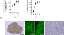 Graft parenchyma or 2-week cultured samples were analyzed by RT-PCR to assess the expression of the following stage-specific marker genes: Gfr-α1, lin28 and ngn3 for spermatogonial stem cells (undifferentiated spermatogonia); c-kit, piwil2 and stra8 for differentiating spermatogonia and spermatocytes; TH2B for spermatocytes; TP-1 for spermatids; and MVh for germ cells. Total RNA was isolated from tissues (~10 mg) and cell clumps (50–100 clumps) using the TRIzol method (Invitrogen). Total RNA (1 μg) was reverse transcribed using a reverse transcription kit (Superscript, Invitrogen) and amplifications of the PCR reaction mixtures (Invitrogen) were performed in a total volume of 20 μl. The following targets were amplified from cDNA using the primers indicated in parentheses: Gfr-α1 (F: 5′-TGCGTATCTACTGGAGCATGT -3′, R: 5′-CATCGAGGCAGTTGTTCCCTT -3′; 171 bp; Gen Bank accession number NM010279); lin28 (F: 5′-CCTTTGCCTCCGGACTTCTC-3′, R: 5′-GGGCGGTCATAGACAGGAAG-3′; 256 bp; Gen Bank accession number NM145833); ngn3 (F: 5′-TCTCGCCTCTTCTGGCTTTC-3′, R: 5′-CGGCAGATTTGAATGAGGGC-3′; 234 bp; Gen Bank accession number NM009719.6); c-kit (F: 5′-TGTGGAGGAGTTGTGGAGGA-3′, R: 5′-CCCACTGCTGAAACAAAGTCA-3′; 492 bp; Gen Bank accession number NM013598.2); piwil2 (F: 5′-CATTATGGTCAAGTATCTGTT-3′, R: 5′-AGAGGTTGGCGAGGAATAAGG-3′; 250 bp; Gen Bank accession number NM021308); stra8 (F: 5′-AAGGACTTGAGGTTTATTCCT-3′, R: 5′-CTGACGTTCATAATTGAAGTC-3′; 345 bp; Gen Bank accession number NM009292); TH2B (F: 5′-AAGGCCTTAAATACCCAGAC-3′, R: 5′-AGCAATGTGTGCCTAAGTTT-3; 254 bp; Gen Bank accession number NM59924); TP-1 (F:5′-AAGGCCTTAAATACCCAGAC-3′; R:5′-AGCAATGTGTGCCTAAGTTT-3′; 254 bp; Gen Bank accession number NM59924); MVh (F: 5′-AGCACAGCCTCTAGTTAAAGT-3′, R: 5′-ATATCAGGTTTCACACTTCTGT-3′; 328 bp; Gen Bank accession number NM010029) and 18S ribosomal RNA (F: 5′-TACCTACCTGGTTGATCCTG-3′, R: 5′-GGGTTGGTTTTGATCTGATA-3′; 255 bp; GenBank accession number NC000083). The PCRs were initiated by denaturation at 94°C for 5 min, followed by 30–35 cycles of 30 s at 94°C, 30 s at 55–60°C and 30 s at 72°C. After a final extension step for 10 min at 72°C, the products were separated by 1.5% agarose-gel electrophoresis. Negative controls included mock transcription without mRNA.