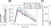 For IPGTT, animals on Western-type diet were fasted overnight and injected with 2 mg/g glucose (Sigma-Aldrich, St Louis, MO, USA) intraperitoneally. IPITT were performed on non-fasted mice with 0.25 mU/g insulin (Actrapid, Novo Nordisk, Denmark). On a 60% HFD IPGTT was performed on mice fasted for 2 h with 1 mg/g glucose or IPITT after 1 h fasting with 0.75 mU/g insulin13. Pooled data from ≥3 experiments are reported. Blood was collected from the tail vein in non-anesthetized mice.