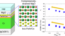 The calculations used the experimental Fe lattice constant, 2.86 Å, for the unstrained calculations and a Fe(100)-MgO(001) distance of 2.16 Å36. Strain was modeled by stretching the x and y lattice between 0 and 1% and the resulting compression in the z-direction was obtained from the Poisson ratios of 0.19 for MgO and 0.37 for Fe37. The same EHMO parameters were used for the strained structures since EHMO parameters are transferable and account for changes in the orbital overlap when strain is applied. k-resolved T(E) spectra were computed for a high resolution 100×100 grid, using a small value (10−6 meV) for the imaginary part of energy.
