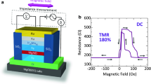 Figure 1(a) shows the Co40Fe40B20/MgO/Co40Fe40B20 MTJ film structure, which was deposited at room temperature by magnetron sputtering. All the film layers were deposited using dc sputtering, except the MgO tunnel barrier and SiO2 encapsulation, which were deposited using rf sputtering. The sputtering pressures for the different layers were in the range of 1–3 mTorr. The MTJ film stack was patterned by photolithography and Ar ion milling to form MTJ junctions with sizes ranging from 36–10600 μm2. Where necessary, the MTJ devices were post-annealed in a magnetic field of 0.055 T under ultra-high vacuum conditions, either at 250°C for 1 hour, or at 350°C for 10 minutes followed by 400°C for 30 minutes. A CIP-GMR film stack of Si/Ta (5 nm)/Ru (5 nm)/Co70Fe30 (4 nm)/Cu (2.6 nm)/Co70Fe30 (4 nm)/Ir22Mn78 (10 nm) was deposited at room temperature by dc magnetron sputtering in an ultra-high vacuum chamber. A magnetic field of 0.055 T was applied during the deposition to exchange-bias the pinned layer.