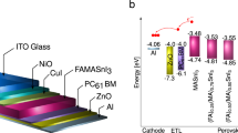 The current-voltage (J-V) characteristics of the unencapsulated PSCs were measured in air using a Keithley 2400 source-measure unit and an AM 1.5G solar simulator (Oriel 94021A, 150 W from Newport). The illumination intensity of 100 mW cm−2 irradiation was calibrated using a KG5-filtered NREL-traceable monocrystal Si reference cell to ensure the accurate light source intensity. The external quantum efficiency (EQE) was conducted using the measurement system (model QE-R) built by Enli Technology Co. Ltd. Same data acquisition system was used for the external quantum efficiency measurement. Under full computer control, light from a 150 W xenon lamp (Oriel, U.S.A.) was focused through a monochromator onto the PSC under testing. The wavelength of the light from the monochromator was increased progressively in the visible region to generate the EQE (λ) as defined by EQE (λ) = 1240 (Jsc/λφ), where λ is the wavelength in nm, Jsc is short-circuit photocurrent density (mA cm−2) and φ is the incident radiative flux (mW cm−2). J-V characteristics and EQE of the unencapsulated PSCs were measured in air.