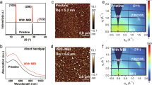 Capacitance versus voltage measurements were performed on parallel-plate capacitors with metal–insulator–metal (MIM) structures to further understand the PMMA influence. As shown in Fig. 4b, MIM samples using P(VDF-TrFE) without and with PMMA both exhibit hysteresis with a butterfly shape. It stems from the irreversible ferroelectric polarization, that is, dipole rotation in the presence of a bias voltage. A higher capacitance is obtained in the sample with a PMMA layer than the one without. Note that polycrystalline P(VDF-TrFE) films naturally have a polarization fluctuation at surface. Higher capacitance in the sample with PMMA-buffered P(VDF-TrFE) indicates a suppression of such a polarization fluctuation by weakening orientation differences of dipole moments among ferroelectric microcrystals. In the case of Fe-OFETs using PMMA, it produces a uniform electrical field at the semiconductor/insulator interface with buffered polarization fluctuation, which is favorable for a smooth charge transport at the conducting channel (Fig. 4c). Also, a control sample using SiO2/PMMA as the gate insulator exhibited a μFET of 3.5 cm2 V−1 s−1, which is in the same range of charge mobility as obtained in the Fe-OFETs with PMMA buffering (Fig. S8). And it confirms that our buffering method can efficiently screen the influence of the polarization fluctuation on the charge transport at the PMMA surface. Besides, further increase in PMMA thickness leads to a reduced capacitance value in the MIM sample, where the thick PMMA acts mainly as a series capacitor (Fig. S9). Moreover, this suppression of polarization fluctuation through our buffering method can be devoted to the interfacial interactions between the carbonyl groups of PMMA and the CH2 groups of P(VDF-TrFE), which allows well-organized P(VDF-TrFE) molecules at the interface32. It thus results in an ordered build-in ferroelectric filed near the interface. Such a study is underway in our laboratory.