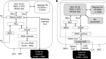 We realized the computer as two chips: a processor core chip that combines the datapath and data memory and a separate print-programmable instruction generator chip for the program memory. The processor core chip also includes an 8-bit accumulator to store results from the ALU. Off-chip communication is performed via an 8-bit output register and an input multiplexer which can store the data in the cache memory. At the core of the ripple carry adder are eight full adder cells based on the mirror adder implementation19. This topology was selected for speed and to reduce transistor count. Only 24 transistors are required to calculate the sum of two 1-bit numbers. Compared to the conventional combinatorial approach of a full adder cell, this minimal transistor count implementation improves area consumption and hence hard yield. The datapath implementation also uses sufficient buffer cells to optimize the critical path delay. The full architecture of the processor core chip is shown in Fig. 2 (c).