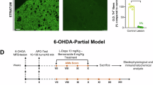 Unilateral 6-OHDA lesions were performed according to our standard procedure16. Briefly, 6-OHDA (2 × 16 μg dissolved in 8 μL of 0.9% physiological saline containing 0.2% ascorbic acid; Sigma-Aldrich, St Louis, MO, USA) was stereotaxically injected into the right medial forebrain bundle (MFB) of rats. The coordinates of the right medial forebrain bundle were calculated using the rat brain atlas as follows (in mm relative to the bregma and the dural surface): 1) anterior-posterior (AP), −4.4 mm, medial-lateral (ML), −1.2 mm, dorsal-ventral (DV), −7.8 mm; 2) AP, −3.7 mm, ML, −1.7, DV, −7.8. The tooth bar was set to −2.4 mm. Animals were anesthetized with ketamine (1–2 ml/kg). For the sham-operated rats, two intrastriatal injections of physiological saline containing 0.2% ascorbic acid were given at the same coordinates. Three week post lesion, the lesioned rats were screened behaviorally using an amphetamine-induced (0.5 mg/kg, i.p.) rotation test and all animals exhibited >7 full body turns/min toward the side of the lesioned side were selected for the next experiment.