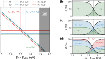 Next, we turned our attention to the in situ characterisation of PL to study the sensing mechanism in depth. The high temperature during film growth can induce unintentional defects on the substrate/MoS2 interface. To prevent defects, we transferred the as-grown MoS2 from the sapphire substrate to a SiO2/p + Si substrate. Interestingly, the atomic-layered MoS2 transferred onto the SiO2/p + Si substrate exhibited opposite gas sensitivity (i.e., p-type behaviour) compared to the n-type behaviour of MoS2 on the sapphire substrate (see Supplementary Fig. S13 for details). Dangling bonds at the semiconductor/substrate interface can redefine the effective Fermi levels within gap states, modulating the conductive properties of the MoS229. The dangling oxygen bonds on the SiO2 surface can result in a p-type MoS2 semiconductor29. In the in situ PL characterisation with the two analyte gases (see Supplementary Fig. S10 for details), we observed various intensity changes in the PL spectra for NO2 and NH3 molecules (Figs. 3c and d). The atomic-layered MoS2 had two main PL peaks associated with the A and B excitons30 (Supplementary Figs. S11). Spin-orbit coupling-induced valence-band splitting can give rise to A and B excitons31. After the gas molecules are adsorbed, the PL intensities of the A and B excitons can either be suppressed or increased by changing the concentrations of the charge carriers32,33. We here focused on the signal peak of the A exciton. The relatively low-energy A exciton signal expands to two features: a trion of A−/+ (two electrons to a hole, resulting in a negatively charged exciton, or an electron to two holes, resulting in a positively charged exciton) and a neutral exciton of A0 32,33. With the emergence of the trion, we assumed that the exciton is coupled to either another electron or to a hole at the Fermi level. In the case of MoS2, the A+ and A0 peaks correspond to the trions (1.8413 eV) and to the neutral excitons (1.8424 eV), respectively. The bare MoS2 notwithstanding, the positive trion (in this case, an electron to two holes, resulting in positively charged excitons, A+) emission dominates the PL spectra because the bare MoS2 on the SiO2 substrate exhibits p-type characteristics, as previously mentioned32. As schematically shown in Fig. 3e, the NO2 molecules on the surface of the MoS2 act as electron acceptors (p-type dopants), whereas the NH3 molecules act as electron donors (n-type dopants)28. By adsorption of NO2 gas molecules, a neutral exciton (A0) can be converted into a quasi-particle (A+) because of excessive holes generated by electron extraction from the MoS234. As a result, the A+ peak in the PL spectrum increases in intensity and the A0 peak is suppressed (Fig. 3c). By contrast, when additional electrons are introduced from the NH3 molecules, the intensity of the A+ peak in the PL spectrum is suppressed because of dissociation of the positive trions from the neutral excitons, resulting in increasing neutral excitons (A0)35, as shown in Fig. 3d. The in situ PL characterisation clarifies the mechanisms of charge transfer between the MoS2 and the gas molecules.