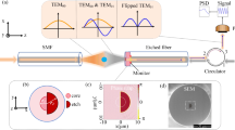 To excite the HOMs in the fibre, a beam with a doughnut-shaped intensity cross-section was created in free space. Linearly polarised 1064 nm laser light (Ventus 1064 3W) was launched onto the display of an SLM to create a first-order Laguerre-Gaussian beam (LG01) at the far field44. Two-mode fibre (Thorlabs, SM1250G80) operating at 1064 nm wavelength with a cladding diameter of 80 μm was chosen for this experiment. The fibre supports the fundamental LP01 and the LP11 family of higher order modes. By coupling the LG01 beam to this fibre, a two-lobed pattern corresponding to the LP11 mode can be obtained at the fibre output. By switching the vortex phase grating on the SLM on and off, the propagating mode in the fibre can be easily switched between LP01 and LP11 with high purity. By choosing an appropriate objective lens, 45% coupling efficiency to the LP11 mode was achieved. A charge-coupled device (CCD) camera was used to image the quality of the beam profile. Figure 4 shows the schematic of the experimental setup.