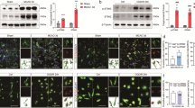 At the indicated time points, mice were sacrificed by perfusion and brain sections were prepared for immunostaining using previously reported methods31,56. Similarly, cultures were fixed at the indicated times and prepared for immunostaining. The following primary antibodies were used: anti-MAP2 (1:200; Santa Cruz Biotechnology), anti-β-actin (1:8000; Millipore), anti-gal-1 (1:100; R&D), anti-MBP (1:500; Abcam), SMI-32 (1:300; Millipore), anti-Iba1 (1:1000; Wako), anti-DDK (1:100; Millipore), anti-GFAP (1:500, Dakocytomation), anti-CD16 (1:500, BD Biosciences) and anti-CD206 (1: 500, R&D Systems). DAPI was used as the nuclear counterstain. Immunofluorescence was visualized on a confocal fluorescent microscope and analyzed by a blinded observer using the Image J analysis system.