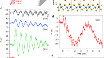 To date, there are no reports on the vibrational properties of 2H- or Td-WTe2. We have explored the vibrational properties as a function of incident photon energy via Raman spectroscopy and the results are shown in Fig. 3. Flakes of Td-WTe2 were exfoliated onto SiO2/Si substrates (each>10 layers thick) and Raman spectra were acquired using 647 and 488 nm laser excitations. With 488 nm excitation, the vibrational modes are dominated by peaks at 112, 133, 163, 165 and 212 cm−1. The same vibrational modes are evident with 647 nm excitation, but with slight frequency shifts and an additional peak appears at 118 cm−1. To understand the origin of the Raman peaks, we used density functional perturbation theory (DFPT)53 to calculate the vibrational modes in Td-WTe2. The calculated modes, as well as the symmetry analysis and their infrared and Raman activity are listed in Table S3 (Supplementary Information) and the phonon modes that correlate to the experimentally observed vibrations (Fig. 3a) are shown in Fig. 3b. Because of the structural distortion induced by metal-metal bonding, the out-of-plane vibrational modes of Td-WTe2 are not oriented perpendicular to the WTe2 sheets. The out-of-plane Raman-active modes for Td-WTe2 are vibrating either along the W-Te bond or at an angle to the vertical line, in contrast to the A1g mode of 2H-WTe2 that involves atomic motion perpendicular to the layer plane. The 118, 133 and 212 cm−1 peaks in the Td-WTe2 Raman spectrum are identified as “tilted” out-of-plane A1 modes at 119, 133, 218 cm−1 and a tilted B1 vibrational mode at 216 cm−1. The two deconvoluted peaks near 163 cm−1 and 166 cm−1 in the 647 nm Raman spectrum in Fig. 3(a) are identified as the in-plane B2 and A1 vibrational modes in different directions; the observed frequencies are close to the calculated 159 and 167 cm−1 frequencies in the model. The other calculated Raman-active modes in Table S3 may be too low in intensity (relative to the background signal) to be observed in the Raman scattering experiments.