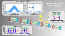 Because of the short resonator length of the mode-locked lasers operating at GHz pulse repetition frequencies, the output pulse energy is rather limited. In passively mode-locked lasers operating without elements controlling the cavity dispersion, the low pulse energy leads to Q-switch instabilities disturbing the phase-lock between modes and therefore limiting the opportunities to achieve CW ML regime19. Recently, the way to avoid such instabilities through generation of solitons under an additional condition when the gain width spectrum is compatible with the pulse spectral width16,19,20 has been shown. In such circumstances, a negative feedback arises between the soliton energy and the overall pulse gain that in turn leads to a highly stable mode-locking regime for soliton formation in a two-mirror resonator with a length of a few mm, the latter supplemented with a Gires–Tournois interferometer, which provides the appropriate negative group delay dispersion (GDD) for round trip in the cavity16,20,21.