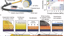 From Fig. 5a–d, it is evident that the color of the samples changed successively from white to light gray to yellow to dark green. Preliminary tests with a digital multimeter showed that the pristine cotton fabric, PGC fabric and APGC fabric were electroinsulating, whereas the APGC-g-PANI fabric exhibited apparent conductivity. This result illustrates that PANI was grafted on the fabric uniformly and a continuous conductive network was formed between fibers throughout the fabric by the PANI graft chains. Although redox polymerization of aniline is well-established, the grafting of PANI on the cotton fabric is a heterogeneous reaction and therefore, the diffusion of aniline molecules in solution towards the fabric substrate surface is critical for obtaining a desired degree of grafting (DG) of PANI. Therefore, the aniline concentration was controlled by feeding drop-wise and the reaction was allowed to proceed under intense mechanical agitation in an ice-water bath. An equal concentration of oxidant, i.e. ammonium persulfate (APS), was added into the reactor in the same manner. The details are provided in the Experimental Section S4 in the Supplementary Information. Figure 5e shows that the DG of PANI in the APGC-g-PANI fabric increases rapidly with an increase in the concentration of aniline up to 0.1 mol L−1. The DG of PANI is around 20 wt.%, when the aniline concentration at 0.1 mol L−1, which is much higher than that (~9 wt.% ) reported previously41. It indicates this multistep route is very effective to graft PANI on common substrates. A further increase in the aniline concentration results in a decrease in the DG, due to the simultaneous occurrence of homo-polymerization and graft polymerization in the system. The high concentration of aniline would cause most of the aniline to be homo-polymerized before diffusing onto the cotton fiber, which would hinder the growth of the graft chain. The electrical conductivity measurements of APGC-g-PANI fabrics with different DG values show that the surface resistance of the fabrics decrease from ~5 × 1011 ohm sq−1 to ~2 × 109 ohm sq−1, at DG values as low as 7.3 wt. % (Fig. 5f), which shows the electrical conductivity increase of the resultant APGC-g-PANI fabrics. It demonstrates a continuous conductive circle has been formed across the entire fabric because the cotton fibers of fabric have been completely covered by PANI grafting layer (Fig. 3d,d’). When the DG of PANI increased to 10.2 wt. %, the surface resistance decreased to ~3 × 108 ohm sq−1. Interestingly, there is no obvious increase in the conductivity of the fabrics when the DG further increases after 10.2 wt. %, suggesting that the thickness of grafting PANI layer on surface of the fibers has been able to overcome the size effect of conductive layer when DG of PANI exceeds 10.2 wt. %.