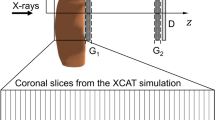 XPCI methods can be roughly divided into three groups, depending on whether they image the phase, the phase gradient, or the Laplacian of phase2. For example, interferometry records the wrapped phase after the object, while grating-based and crystal-based methods record the refraction angle or the phase gradient. Inline holography methods, also known as propagation-based methods, record the Laplacian of phase. There is a misconception that the phase-contrast signal is stronger than the attenuation-contrast signal because the real part of refractive index is typically 1000 times stronger than the imaginary part. However, a fair comparison between the attenuation- and phase-contrast signals has to be made in the image domain. The similarity between the images in Figs 3a,b suggest that the phase contrast is not particularly stronger than the absorption contrast. However, the XPCI methods recording the gradient or the Laplacian of phase amplify the signal from small features. Therefore, the phase-contrast signal from small features such as bronchial trees can be stronger than the corresponding attenuation-contrast signal. Grating-based methods record the gradient of sample-induced phase alteration and can be built on a laboratory source with low spatial and temporal coherence. However, its signal-to-noise ratio is known to be quite low47. In-line holography methods can also be built on a laboratory source and provide high signal-to-noise ratio, but require a source with high spatial coherence and a detector with small pixels and high dynamic range48. Importantly, new XPCI systems are being developed to overcome the limitations of existing systems19. The numerical framework developed in this study can be used to predict the performance of these new systems at a human scale, optimize design parameters (e.g., source voltage, spectrum) and rigorously assess the performance of a reconstruction algorithm.