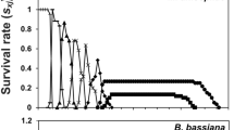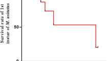 The experimental units contained two uniform Plexiglas (6 cm × 5 cm × 4 mm) containers. Water-saturated filter paper was placed on the bottom of one piece, with a freshly excised kidney bean leaf added upside down on the filter paper surface. A hole (2.5-cm diameter) was punched on another piece of glass and pressed onto the leaf. A chamber was formed between two pieces of organic-glass as an experimental platform. Sixty eggs of N. barkeri were randomly collected from the colony within 6 h. Each egg was transferred carefully into an individual chamber using a fine paintbrush. The experimental units were placed on Petri dishes (20-cm diameter) with moist sponges at the bottom and then placed in a climatic chamber at 25 ± 1 °C, 65 ± 5% RH and L16:D8 h photoperiod. The first instar larvae of F. occidentalis were sprayed with a conidia suspension (108 conidia mL−1) with a small hand pressure sprayer (2 ml)38. After 12 h, the treated thrips were supplied with N. barkeri as prey. The units were observed every 12 h until the eggs hatched into larvae. In the preliminary test, each larva developed into a protonymph normally without feeding. Therefore, in our life table study, when the larvae developed into a protonymph, each protonymph was provided 5 B. bassiana-treated F. occidentalis larvae as prey every 12 h and each deutonymph was provided 10 B. bassiana-treated F. occidentalis larvae as prey every 12 h. The survival and development time of each stage were recorded every 12 h. Because the female deutonymphs generally develop females slower than males, the newly emerged males continue to be provided with 10 treated F. occidentalis larvae as prey every 12 h. The newly emerged females were paired with young male adults recruited from the colony for mating in individual chambers and provided 20 treated F. occidentalis larvae every 12 h. The number of F. occidentalis larvae was based on the preliminary feeding test. Survivorship, fecundity and predation were recorded every 12 h for N. barkeri. Because each protonymph, deutonymph and male was housed in an individual chamber, predation was recorded every 12 h for each individual. However, because the adult females and recruited males were housed as pairs in an individual chamber, we ignored the differences between the sexes and one-half of the daily predation of a pair was assigned to each female as long as both remained alive. If the male died, the total daily predation rate was attributed to the female and if the female died, the experiment was terminated. The control was the untreated-F. occidentalis larvae and was performed as described above.
