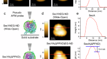 All AFM images were acquired in recording buffer at ~30 °C in tapping mode using a commercial instrument (Asylum Research, Cypher). Care was taken to control the magnitude of the tip sample force to (estimated by comparing the free amplitude to the set point amplitude). Under such conditions, minimal protein distortion is expected35,46. Spring constants were determined using the thermal noise method. Details for each sample preparation follow. Glass alone: The recording buffer was 10 mM HEPES pH 8.0, 200 mM KAc, 5 mM MgAc2; the tip used for the data shown in Fig. 1a,b was MSNL (Bruker) with spring constant ~0.4 N/m, a biolever mini (BL-AC40TS, Olympus) was used for Fig. 1c–f with spring constant ~0.06 N/m. Bacteriorhodopsin on glass: A solution was prepared by diluting bacteriorhodopsin to 45 μg/ml in 10 mM Tris, pH ~ 7.8, 300 mM KCl buffer. Equal volumes of this solution and adsorption buffer (10 mM Tris, pH ~ 9.2, 700 mM KCl) were mixed before depositing onto a freshly cleaned glass support. After 1 hour incubation, the sample was rinsed with 10 volumes of recording buffer (20 mM Tris pH ~ 8.5, 200 mM KCl, 20 mM MgCl2). SNL (Veeco) tips with measured spring constant ~0.4 N/m were used. SecYEG and coassembled SecYEG/SecA complexes on glass: Proteoliposome stock solutions were diluted to 80 nM SecYEG (or 80 nM coassembled SecYEG/SecA complexes), 80 μM lipid in recording buffer (10mM HEPES pH 8.0, 200 mM KAc, 5 mM MgAc2), immediately deposited on a freshly plasma cleaned glass support and incubated for ~20 minutes, followed by rinsing with recording buffer. Biolever mini tips (BL-AC40TS, Olympus) with measured spring constants ~0.06 N/m were used. Bacteriorhodopsin on mica: Following established protocols29, equal volumes of stock solution and recording buffer (10 mM Tris pH ~ 7.6, 150 mM KCl) were mixed before depositing onto a freshly cleaved mica support. After a 1 hr incubation, the sample was rinsed with 10 volumes of recording buffer. SNL (Veeco) tips of measured spring constant ~0.4 N/m were used.
