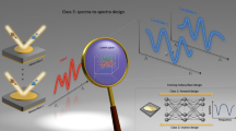 We measure infrared reflectance and transmittance spectra with a Fourier-transform spectrometer (Bruker Vertex 70v, middle-infrared globar source) combined with an infrared microscope (Bruker Hyperion 3000, 36x Cassegrain objective, liquid-N2-cooled MCT detector) using a circular light spot of 16 μm diameter at a resolution of Δν = 8 cm−1 wavenumbers. We tilt the sample and cover 3 quadrants of the objective to obtain a normal incidence geometry with a half opening angle of 7.5°. The reflectance spectra are normalized to a gold mirror. For measurements using the liquid-N2-cooled FPA detector (64 × 64 pixels) we employ a 36x Cassegrain objective (NA = 0.5, opening angles between 15°–30°) and a near-infrared halogen lamp. The pixel resolution of 1.1 μm leads to diffraction-limited intensity maps over the full spectral range. For a clearer visual representation the maps are resized by a factor of 4 using the MATLAB function imresize with bicubic interpolation. Spatially resolved transmittance spectra are collected at a resolution of Δν = 16 cm−1 with 1024 scans and are normalized to the glass substrate.