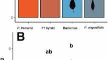 The interspecific hybrids showed qualitative morphological traits similar to R. obtusifolius in terms of presence or absence of leaf hairs on the abaxial side, basal leaves and reddish color on leaves and stems. By contrast, the hybrids showed intermediate patterns between R. obtusifolius and R. longifolius in terms of the quantitative morphological traits stem height and leaf size. The leaf dimensions, a quantitative morphological trait, of hybrids between two Salix species are intermediate between the two Salix species, although the qualitative morphological traits of the hybrids are similar to those of one of the two Salix species30. Qualitative morphological traits are controlled by one or two genes whose expression appears to be largely dominant31, but quantitative morphological traits are considered to be controlled by multiple dominant genes32 and are affected by genetic variations due to backcross. Probably, the qualitative morphological traits of the interspecific hybrids in this study are also controlled by dominant genes of R. obtusifolius. Quantitative morphological traits of interspecific hybrids are intermediate between the parent species33. The number of chromosomes is 2n = 40 for R. obtusifolius and 2n = 80 for R. longifolius; the number of chromosomes of the interspecific hybrids is 2n = 60, intermediate between the parent species22, indicating that the quantitative morphological traits of the hybrids probably became intermediate.