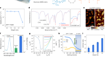 The produced PECA fibers were used for the creation of textured coatings with special wetting properties. Initially, glass substrates were uniformly coated with layers of PECA nanofibers and then thermally treated at 150 °C for 20 s on a hot plate. The temperature for the treatment of the fibrous networks was selected in order to obtain coatings with a high degree of optical transparency, while limiting the thermal degradation of the polymer. TGA measurements in Fig. 3a indicate that the PECA electrospun mats had the maximum degradation at 210 °C and they completely degraded at 300 °C, in agreement with previous reports on PECA29,30. We measured a weight loss of 35% at 150 °C, mainly due to the complete evaporation of water that was trapped inside the porosity of the electrospun web (at a temperature lower than 100 °C) and only partially due to the thermal degradation of the PECA fibers. Real-time observations of the dynamics of the formation of the textured PECA coatings (Figure S2 in the Supplementary Information) show, as expected, that the fusion of the fibers started from the layers closer to the substrate, which were in direct contact with the heating source. Then, it propagated through the upper layers of fibers. As result, the fibers fused together, forming interconnected features that recalled the entangled geometry of the initial fibrous network (Fig. 3b). It is worth noting that the produced micro-structured coatings were highly transparent to visible light, with a transmission spectrum (solid green line in Fig. 3c) comparable to that of the pristine glass substrate (white circles in Fig. 3c). In fact, the thickness (lower than 100 nm) and the low surface roughness of the coatings guaranteed a reduced scattering of the light, leading to high transparency31. On the contrary the glass slide coated with the PECA fibers, before the thermal treatment, was optically opaque (solid black line in Fig. 3c). A direct comparison between the as-prepared (sample on the left) and treated (sample on the right) fibrous network is shown in Fig. 3d.