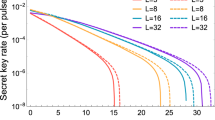 We simulate the finite-key rates for both of PDS QKD protocols based on the models. The values of some experimental parameters in Eqs (10,11) are supposed to be as follows. Assume Alice’s detector is a typical silicon avalanche photodiode with dA = 3.2 * 10−7 and . Other experimental parameters are chosen as Refs 10,23, 24, 25, 26, 27, 28, 29, 30: the detection efficiency of Bob’s detectors