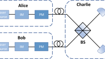 Note that there should be an intensity modulation (IM) before Bob’s Lab and its operation is correlated with the length of delay coil. Denote the state of the upper path and that of the lower path after BS1 at time i as ρ1i and ρ2i. We can adjust the length of the delay coil on the upper path to make the pulse ρ1,i−1 sent at time i − 1 and the pulse ρ2i sent at time i interfere at BS2. In order to eliminate all the possible correlations between the results hold by Bob, IM should block the pulses arrived at even time or at odd time. Now the signal states that go to Bob are guaranteed to be tensor products of mixtures of Fock states.