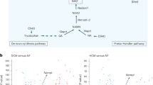 NAD+ and NMN levels were determined using an HPLC system (Shiseido Co., Ltd.) with a CAPCELL PAK C18 MGIII S5 column (15 cm × 2.0 mm; Shiseido) and a YMC-Pack Pro C18 RS column (15 cm × 4.6 mm; YMC Co., Ltd.), respectively, as described previously10. Frozen tissues or freshly collected plasma of mice, or cultured cardiomyocytes were extracted in 1 M perchloric acid (200 μl/10 mg tissue, 100 μl/10 μl plasma, 500 μl/6 cm dish). The extracts were centrifuged at 15,000 rpm for 10 min at 4 °C and the resulting supernatants were neutralized in 3 M K2CO3 on ice for 10 minutes. After clearing extracts, aliquots of 100 μl were mixed with 50 μl of buffer A (50 mM K2HPO4/KH2PO4, pH 7.0) and 50 μl of water. For NAD+ measurement, the HPLC was run at a flow rate of 200 μl/min with 100% buffer A from 0–5 min, a linear gradient to 95% buffer A/5% buffer B (100% methanol) from 5–6 min, 95% buffer A/5% buffer B from 6–11 min, a linear gradient to 85% buffer A/15% buffer B from 11–13 min, 85% buffer A/15% buffer B from 13–23 min and a linear gradient to 100% buffer A from 23–24 min. For NMN measurement, the HPLC was run at a flow rate of 700 μl/min with 100% buffer A from 0–5 min, a linear gradient to 60% buffer A/40% buffer B from 5–10 min, 60% buffer A/40% buffer B from 10–32.5 min, a linear gradient to 100% buffer A from 32.5–35 min. NAD+ and NMN were usually eluted at 14 min and 25 min, respectively. NAD+ and NMN levels were quantitated based on the peak area compared to a standard curve and normalized to the weight of frozen tissues, the volume of plasma and the number of cultured cardiomyocytes.