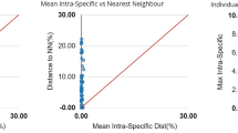 Bidirectional sequencing was employed to decrease the occurrence of sequencing mistakes. The COI sequences were initially edited using the DNASTAR multiple package (DNASTAR Inc., Madison, WI, USA) and aligned using the CLUSTALX 2.0 program57. The noisy sequences of both ends were trimmed before subsequent sequence analyses. We used distance-, tree-, and character-based DNA barcoding methods for species discrimination. Genetic distances within species, genera and families, determined using the Kimura 2-parameter (K2P)58 and p distance, were inputted into the MEGA 4.1 program59. To examine the barcode gap, species-level comparisons between the maximum intraspecific genetic distance and the minimum distance to the nearest neighbor were performed using the ‘Barcoding Gap Analysis’ tool in BOLD60 and three singleton species were excluded. A regression analysis was performed to assess the relationship between species size and the mean intraspecific divergence. Neighbor-joining (NJ) trees based on the K2P and the p distance were implemented in MEGA 4.1 using 1000 bootstrap replicates to assess the branch support. However, we found that the differences in genetic distance and tree topology between the two trees (K2P and p distance) were minimal. Consequently, only the K2P model was chosen for tree reconstruction because it is commonly employed to evaluate phylogenetic relationships between species in DNA barcoding studies18,61. Finally, we used BLOG 2.0 to perform a character-based identification method with default parameters for species represented by greater than two individuals62,63,64. This method is mainly based on only the nucleotides of the specific sites in particular taxa for species diagnosis and these diagnostic sites are referred to as nucleotide diagnostics (ND)65,66.