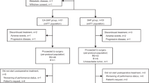 Patients proceeded to surgery during the 2–3 weeks after completion of the neoadjuvant chemotherapy. After laparotomy, the resectability was evaluated. The standard surgery for primary gastric cancer was D2 lymphadenectomy. The definition for lymphadenectomy was based with the Japanese Research Society for Gastric Cancer rules12. Depending on the location of the primary tumor, the surgeon performed either a total or distal subtotal gastrectomy. After a macroscopic curative resection was achieved, the patients were strongly recommended to undergo postoperative chemotherapy using intravenous chemotherapy following EOX regimen for 4 months, as long as the tumors did not recur. Pathologic analyses of the tumor specimens were performed following surgery. The pathologic treatment response was determined by two pathologists re-analyzing pathology slides. Neoadjuvant treatment response was evaluated using tumor regression grade (TRG), which was microscopically evaluated using the scale proposed by Mandard’s et al.13. Regression was graded as follows: TRG0, no regression, fibrosis was completely absent; TRG1, minor regression, dominant tumor mass with obvious fibrosis in 25% or less of the tumor mass; TRG2, moderate regression, dominant tumor mass with obvious fibrosis in 26% to 50% of the tumor mass; TRG3, good regression, dominant fibrosis outgrowing the tumor mass; more than 50% tumor regression; TRG4, total regression, no viable tumor cells; only fibrotic mass. TRG 3 and 4 was defined as tumor regression for the purpose of statistical analysis, which was referenced by previous studies14. Acute toxicities were graded according to the National Cancer Institute Common Toxicity Criteria version 3.0. Curative resection (R0) was defined by the absence of tumor macroscopically or microscopically after operation. The severity of surgical morbidity was evaluated by the Clavien–Dindo classification15.