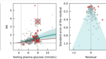 For the dose-response meta-analysis, we used the generalized least squares trend (GLST) model proposed by Greenland and Longnecker34,35 to estimate the trend in the effect. Based on the construction of an approximate variance-covariance matrix for the log relative risk, this approach could be employed to obtain a corrected linear association using general least squares. A cubic spline model with 3 knots at the 25%, 50% and 75% percentiles of the distribution was established to explore the potential non-linear relationship between glucose concentration and the relative risk for colorectal cancer and a P value for non-linearity was calculated by testing the null hypothesis that the coefficient of the second spline was equal to zero36. For each study, the median or midpoint of the upper and lower boundaries was assigned as the mean glucose concentration in each category. If the lower boundary of the lowest category was not available, it was then defined as 70 mg/dL, which is the lower limit of normal blood glucose concentration37. When the upper boundary of the highest category was not provided, it was calculated as the lower bound plus 1.5 times the width of the neighboring category. We unified FPG as the exposure indicator because it is a common diagnostic criterion for prediabetes and T2DM and provides one common laboratory value to describe the metabolic syndrome. All of the studies that reported only HbA1C38,39,40,41 or glycoalbumin (GA)42 for blood glucose concentration were discarded, as we could not accurately convert them into FPG data (see the Appendix for data synthesis and analysis).