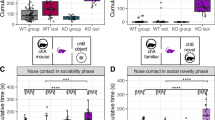 Mice (10 month of age) were habituated to a larger cage (26 × 48.3 × 20.3 cm) for 90 minutes daily on two consecutive days prior to the experiment. During testing, two mice were placed together in a fresh cage for 10 minutes. The time spent in contact and mounting behavior were recorded from a camera mounted overhead and analyzed by an automated tracking program (TopScan, Clever Sys Inc.). The time spent in contact was determined based on proximity of the paired mice in TopScan. Sessions 1–4 were given with 5–7 days in between. One male and one female mouse of the same genotype were randomly paired up in sessions 1–3. In session 4, one male and one female mouse of the opposite genotype were randomly paired up (see Fig. 4B,C). One adult male of either genotype and one juvenile mouse (wild-type male) were randomly paired up in male-juvenile interaction test (see Fig. 4A,D). Juvenile male C57BL/6 mice (4 weeks of age) were purchased from Charles River Laboratories. Two female mice of the same genotype were randomly paired up in female-female interaction test (see Fig. 4A,E)