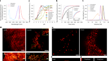 Absorption spectra were recorded using a Jasco V-630 UV/VIS photospectrometer (Easton, USA). Excitation (λem = 540 nm) and emission (λex = 480 nm) spectra as well as refolding, maturation and expression kinetics were recorded using a Biotek Synergy H4 microplate reader (Winooski, VT, USA). Emission spectra were obtained using excitation at 480 nm while excitation spectra were obtained measuring fluorescence at 540 nm. Molar extinction coefficients were determined using the Ward method51. Fluorescence quantum yields were calculated relative to fluorescein (ΦFL = 0.95) and cross-validated between proteins using the method described by Williams et al.52 pKa values were determined by measuring the anionic absorbance peak of the various FPs as a function of pH, using different buffers [citric acid (pH 3.5), sodium acetate (4.0–5.0), MES (5.5–6.5), HEPES (7.0–8.5), CHES (9.0–9.5)]. Thermal stabilities of the switched-off RSFPs were measured by monitoring the absorption as a function of time, every 10 minutes for 1 to 5 days. Photoinduced fluorescence recoveries of switched-off FPs were measured at 20 °C with a CCD-based spectrometer (AvaSpec-ULS2048, Avantes, Eerbeek, The Netherlands) coupled with optic fibres to a cuvette holder. Diluted proteins (50 μl) were placed in a 50-μl 3-window cuvette and a square diffuser (Thorlabs, ED1-S50) was put in front of the cuvette to ensure homogeneous laser excitations at 488 nm (1.9 mW/cm2) and 405 nm (2.2 mW/cm2). Fluorescence emission was measured every 2 s (λem = 506 ± 4 nm for rsEGFP2, rsFolder and rsFolder2; λem = 512 ± 4 nm for Superfolder-GFP).