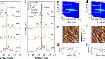 X-ray diffraction and reflectivity measurements are performed using a Rigaku SmartLab instrument. STO (002) peak is used as the reference for sample alignment. Inter-planar spacing along the c-axis is determined following Bragg’s law: n⋅λ = 2⋅d⋅sinθ, where integer n denotes the reflection order, λ is the x-ray wavelength, which is 1.54055 Å for Cu Kα radiation, d is the inter-planar spacing and θ is the diffraction angle. The thickness of the films is determined using x-ray reflectivity data and transmission electron microscopy (TEM) results.
