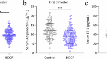 In preeclamptic women, a strong positive correlation between serum adipsin levels and BMI (r = 0.87; p < 0.00) (Supplementary Fig. 1A) and HDL-cholesterol levels (r = 0.57; p = 0.04) (Supplementary Fig. 1B) was observed in early pregnancy. A strong negative correlation between the adipsin levels and triglycerides levels (r = −0.57; p = 0.04) (Supplementary Fig. 1C) was observed in early pregnancy (Supplementary Table 3). Also, in late pregnancy, strong negative correlations between the adipsin levels and systolic BP (p < 0.0 r = −0.77) (Supplementary Fig. 1D), glucose levels (r = −0.77; p < 0.00) (Supplementary Fig. 1E), total cholesterol (r = −0.76; p < 0.00) (Supplementary Fig. 1F) and LDL-cholesterol levels (r = −0.92; p < 0.00) (Supplementary Fig. 1G) were observed (Supplementary Table 3). Additionally, no significant correlation between the levels of adipsin and leptin was found in each of the three trimesters of gestation (Supplementary Table 3).